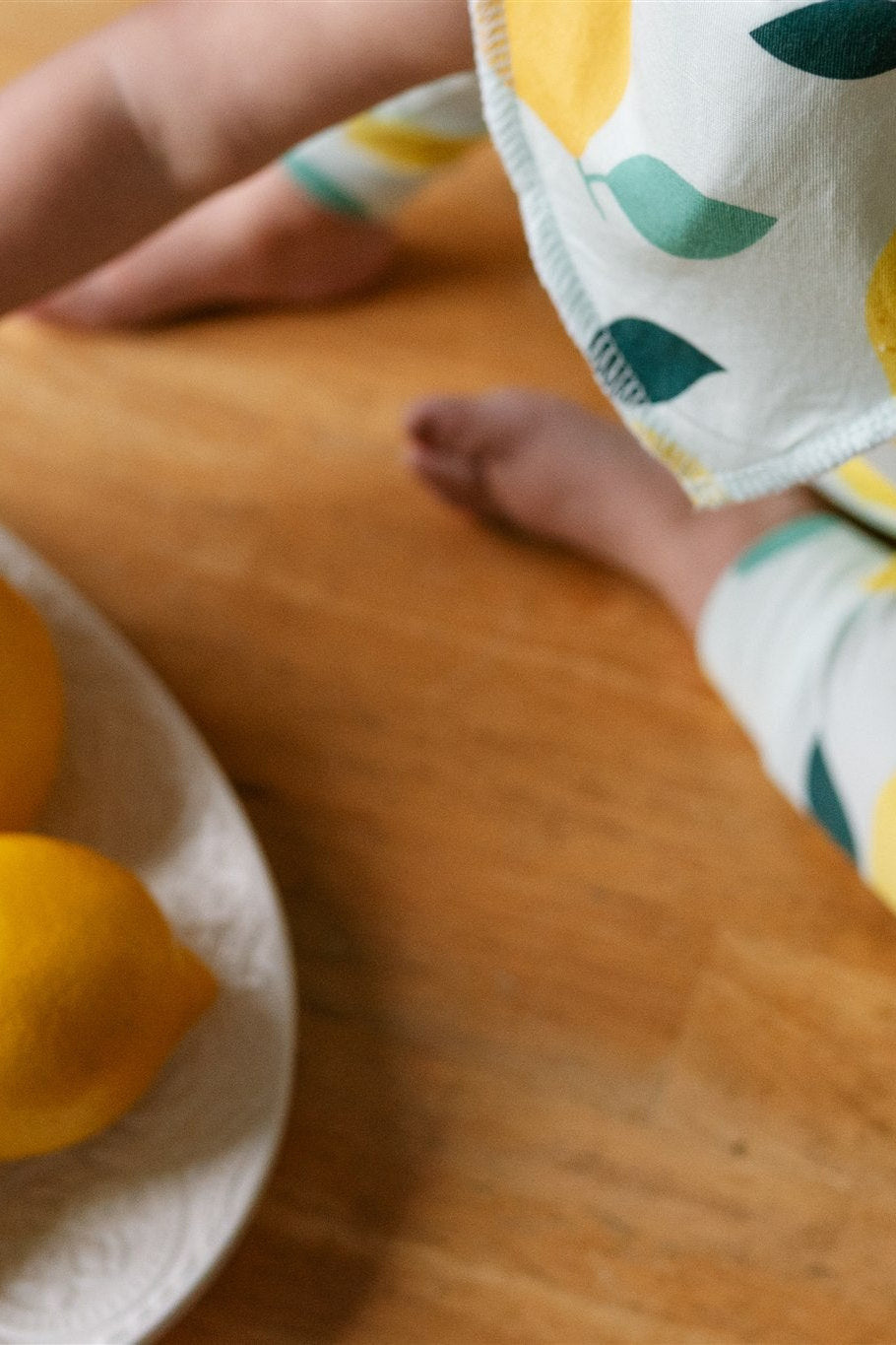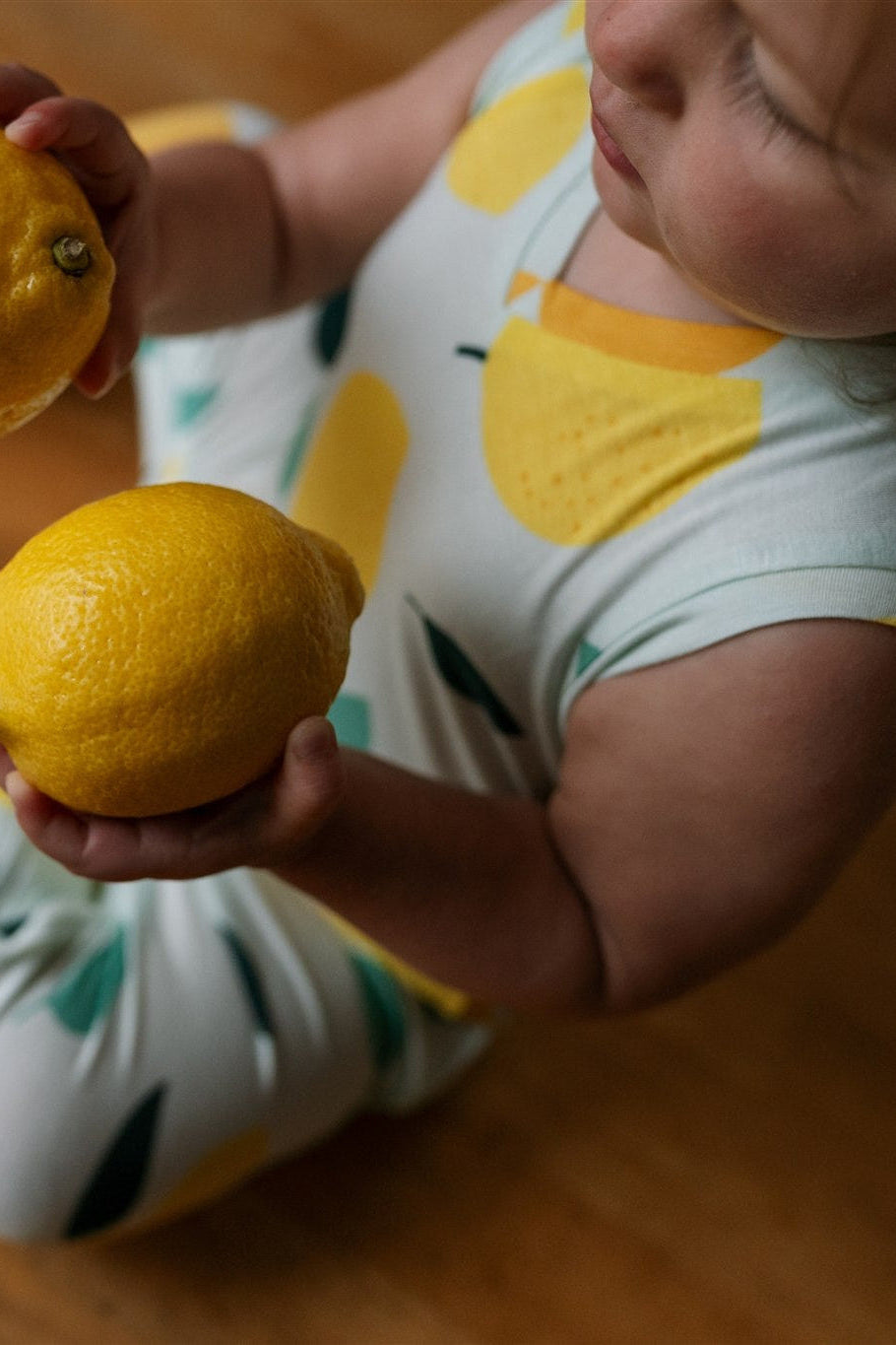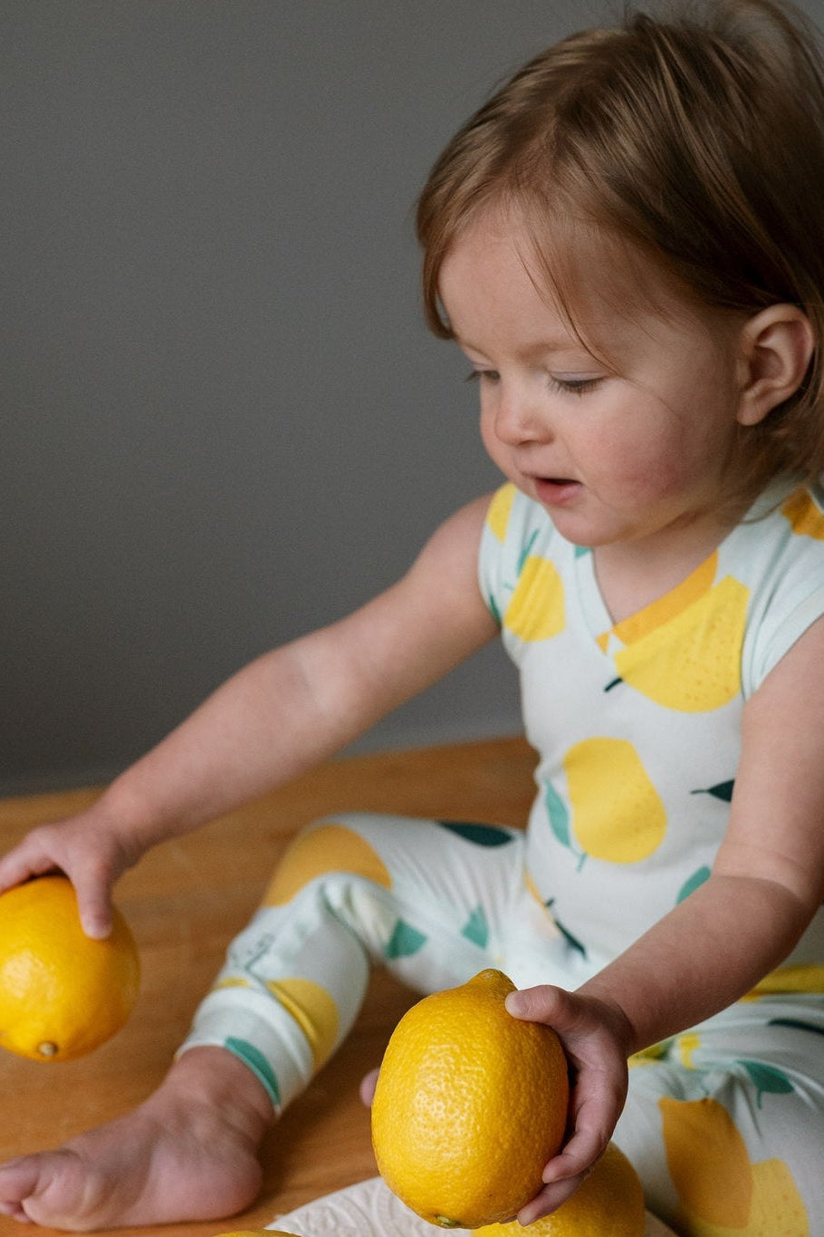 Child in a lemon-patterned outfit playing with lemons on a wooden table.