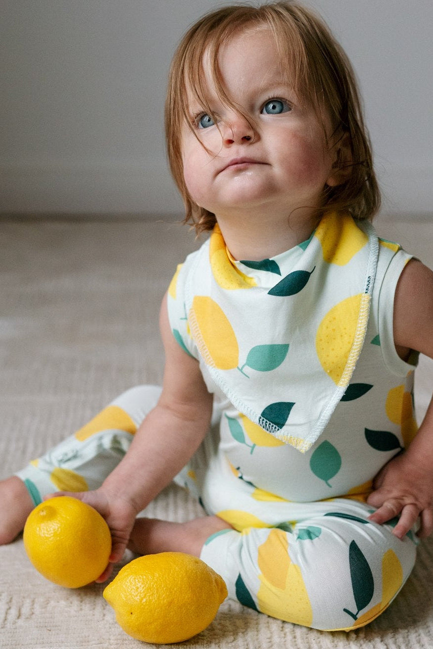 Child playing with lemons while wearing ZippyJamz lemon patterned romper