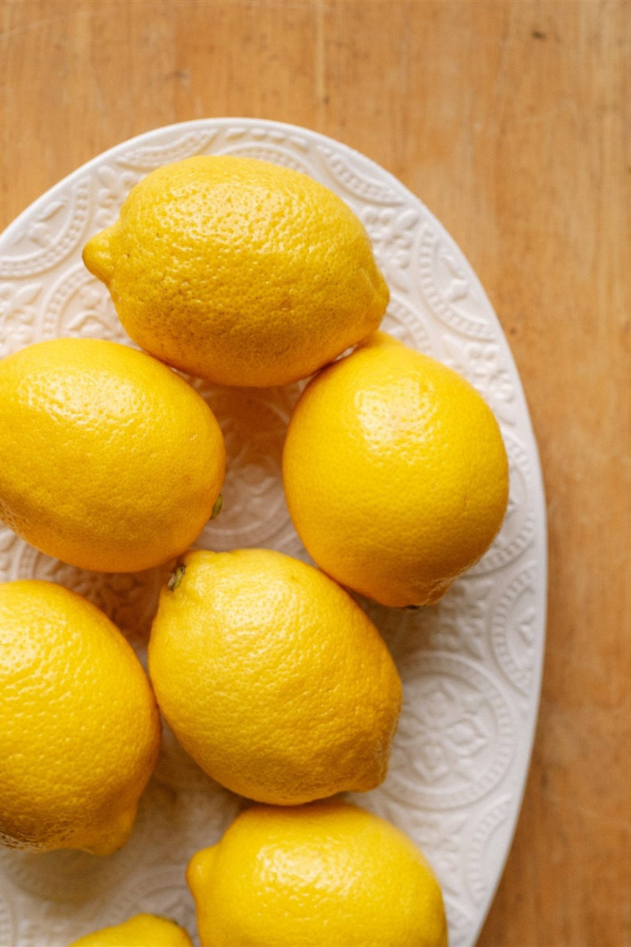 Child holding lemons on a wooden table with a plate of lemons in the background.
