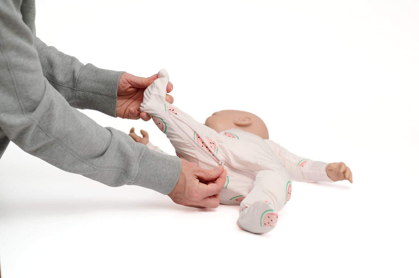 Baby crawling on a neutral carpet wearing footed ZippyJamz watermelon patterned sleeper