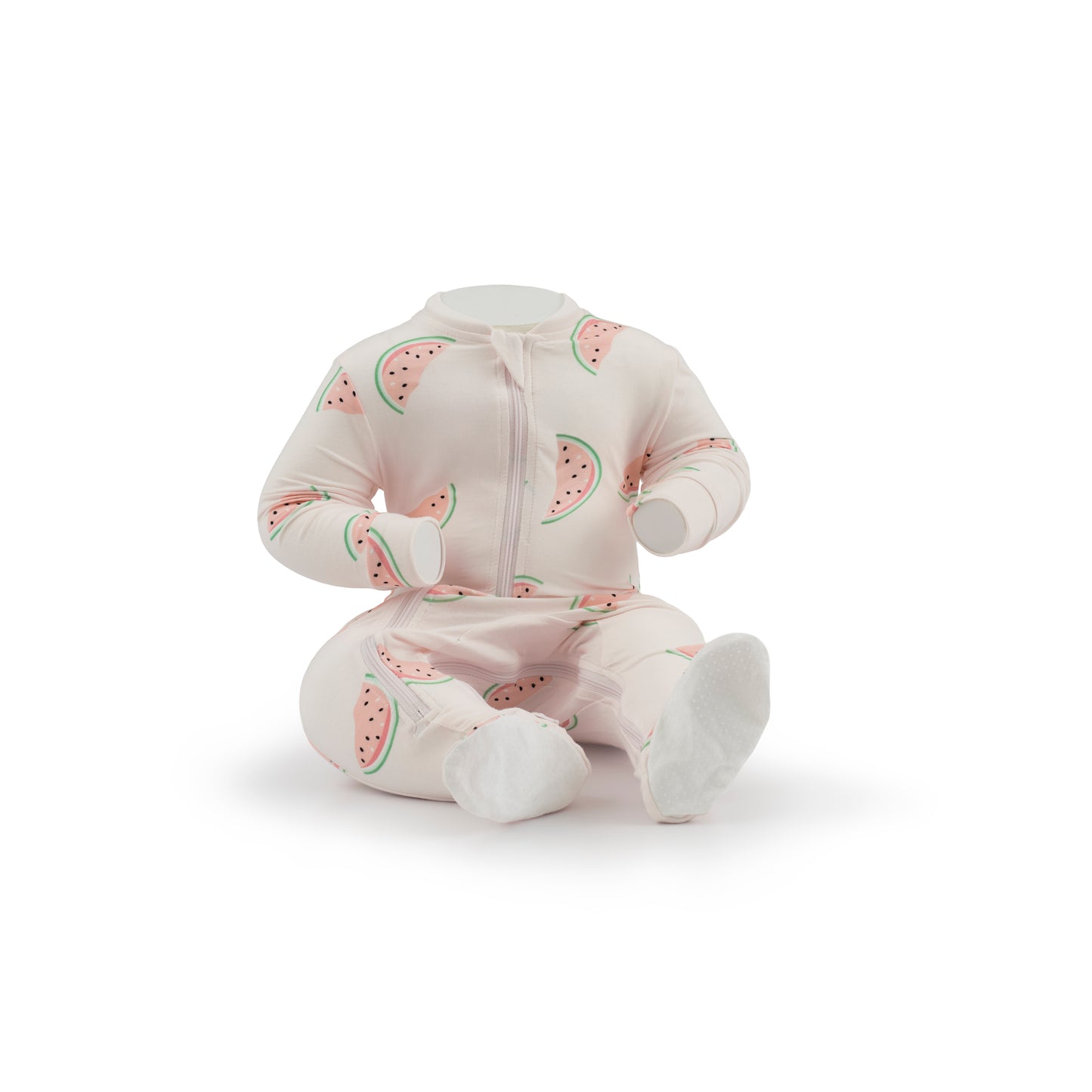 Child wearing a pink sun hat and watermelon-patterned ZippyJamz footed bamboo sleeper on a neutral background